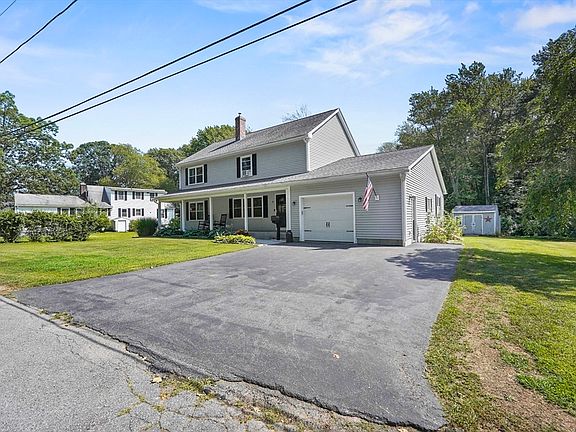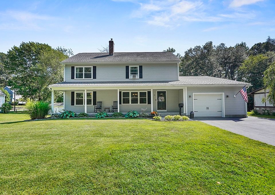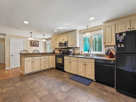 Welcome to this beautifully maintained 5-bedroom, 3-bath home, greeted by a charming, covered front porch. Enter inside to a spacious dining room w/ hardwood floors & a cozy pellet stove insert, seamlessly flowing into the open-concept kitchen. The kitchen boasts ample cabinet & countertop space, breakfast bar & a convenient pantry closet. The generous living room features hardwood floors, vaulted ceilings w/ exposed beams & direct access to the back deck—perfect for relaxing or entertaining. The main level offers two bedrooms & a full bath, while the second level hosts the primary suite w/ a walk-in closet & private full bath, plus three additional bedrooms & another full bath—all accented with hardwood floors. The partially finished basement includes a family room w/ a pellet stove, wet bar & recessed lighting. Out back, enjoy a spacious deck, storage sheds, and plenty of room for summertime fun. This home blends comfort, character, and functionality in every space!