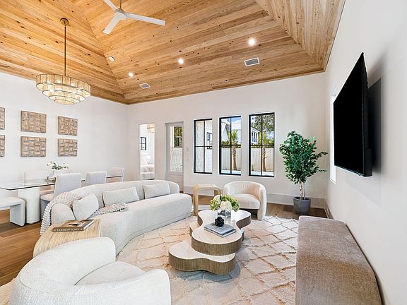 Located in the gated Lakeside Inlet Beach community, this newly built home by Focus Construction blends high-end craftsmanship with coastal elegance. Just minutes from Rosemary and Alys Beach, and steps from Lake Powell, this residence offers the perfect combination of luxury and convenience.Step inside to soaring 11' ceilings on the first floor accented by rich hardwood floors and cypress wood ceiling details. The vaulted living room creates a light-filled gathering space that flows seamlessly into the gourmet kitchen, complete with Thermador appliances, custom shaker cabinetry, a walk-in pantry, and champagne-accent hardware. The first floor features two bedrooms with ensuite baths, including a stunning primary suite with a vaulted ceiling, spa-style bathroom with a garden tub, frameless glass shower, and custom walk-in closet.