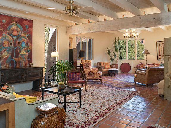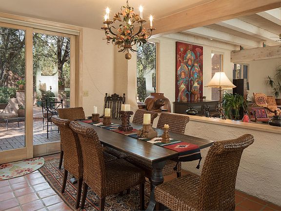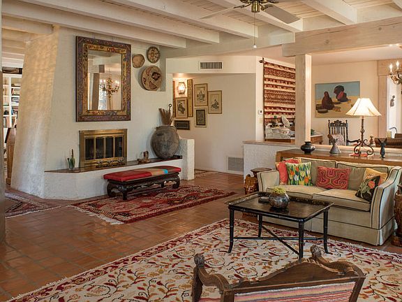 Come; be enchanted by this lovely home with its thick, stuccoed walls and blend of Southwest styles that evoke the magic of Old Santa Fe. Heavy wood beams, rustic Saltillo accented with richly colored Talavera tiles, wood-burning fireplaces, and touches of wrought iron bring an elegant patina of age, style with substance, and an abundance of character. There is ample space for entertaining with a formal dining room that opens onto a generously proportioned, curved-wall great room. You and your guests will be drawn from there to wander in the private, walled garden with red rock views and several inviting seating areas. The main house is one level, with two bedrooms, two full baths, kitchen, breakfast nook, laundry room, formal dining room, great room, and library. Continued . . .