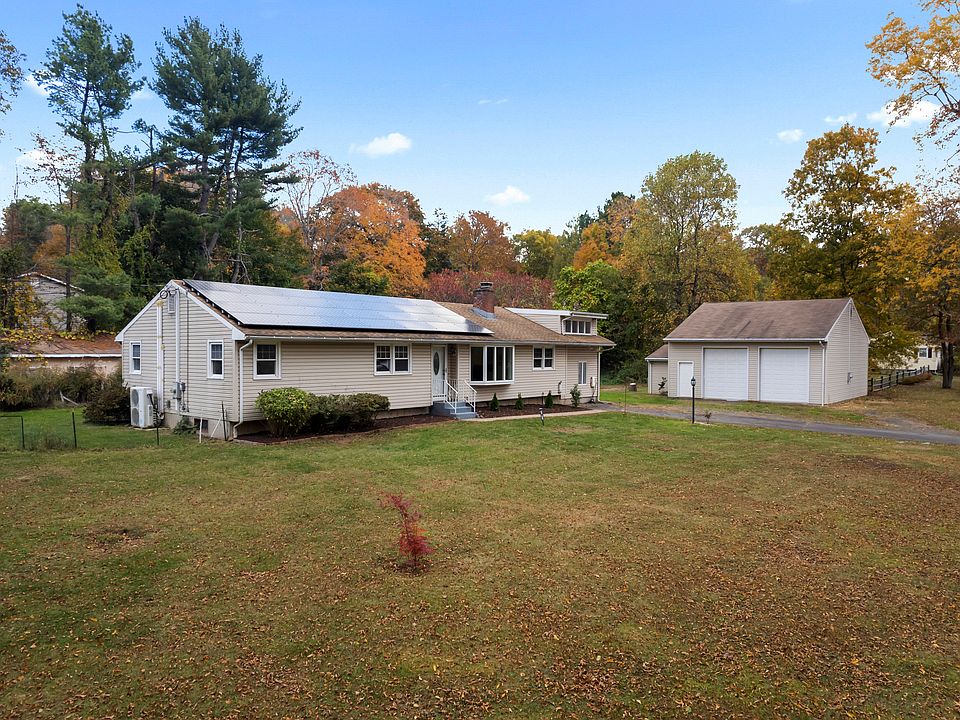 Tastefully remodeled 3 bedroom, 2 bath 2265 SQ FT ranch with amazing .92 acre flat lot with incredible detached 2 car high bay garage with lift-perfect for car enthusiast or contractor! Spacious living room with refinished hardwood floors, fireplace with insert and oversized bay window. Remodeled eat in kitchen with white cabinetry, marble counters, SS appliances and stylish backsplash. Small dining room off of kitchen with glass slider leading to deck-perfect for BBQ. Wood paneled family room with slider access to large three season room with vaulted ceilings and endless possibilities. Large primary bedroom with refinished wood floors and two closets. Beautiful remodeled tile bathroom. The second bedroom has refinished floors and ceiling fan. The third bedroom is located on the opposite side of the house from the primary and has a versatile two room layout with sleeping space on lower level and then a staircase leading upstairs with bonus space perfect for office, den or play space. The house has 4 split units for air conditioning, solar, and a huge basement for storage. Incredible .92 acre level corner lot with large garden and ample parking. This house is really a rare find!