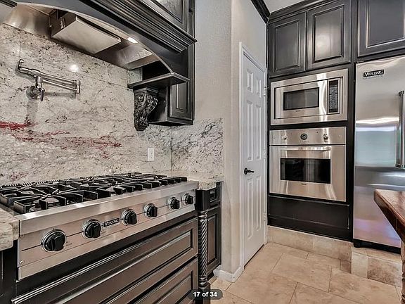 - Gourmet kitchen with Viking stainless steel appliances, granite countertops, dark cabinetry & wine grotto