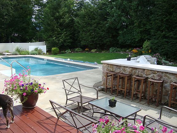 Colonial with 4 bedrooms, 2.5 bathrooms on 1/2 acre with outdoor bar, inground pool and privately fenced yard. Basement is finished into family room, exercise room and storage room. Large eat-in kitchen with island and cherry cabinets. Hardwood and tile throughout first floor. Granite counter tops in bathroom. Custom molding. Family room has 10 ft. ceiling, transom windows, gas fireplace with sliding door that walks out to deck. L:aundry room and office on first floor. Security and sprinkler systems.