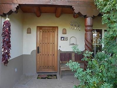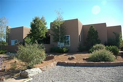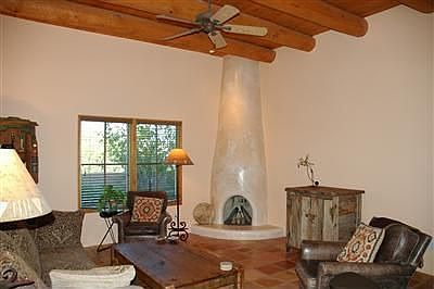 Ambience & character in every nook & cranny of this lovely custom designed and built home by Adobeworks, Inc. Open plan design with spacious flow from the kitchen through the dining area to the living room with hand trowelled kiva fireplace and wonderful Sangre de Cristo mountain views. Portalled flagstoned patios nestled in lovely walled garden extends the dining experience! Large fenced rear yard with drip irrigation on south side for sunset views!