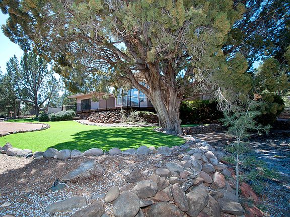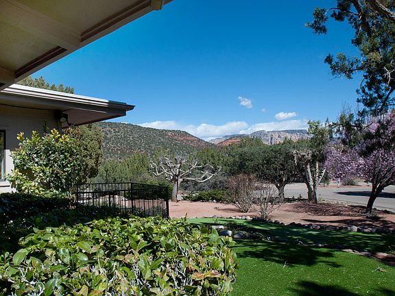 This beautifully maintained classic adobe brick home is on almost a half acre of private land in the quiet neighborhood of Yavapino Estates in the Chapel area. This property has been lovingly taken care of and updated. The main home has red rock views over a tree line that gives the home privacy. The home has two bedrooms and a study/extra potential bedroom. All these bedrooms are separated from each other with the kitchen and great room in between for a greatly flowing floor plan. The kitchen was updated in 2017 with new white cabinets and countertops for a light airy feeling. The great room has cathedral ceilings with high windows of glass overlooking the large wrap around wooden deck that looks out at the red rocks of Sedona and the precisely manicured lot. See (more)