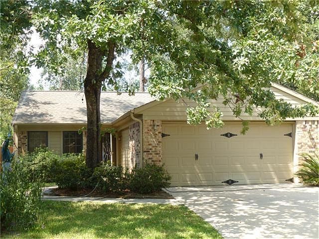 Adorable cottage-style brick one story in the heart of The Woodlands on a cul-de-sac street! 4Br/2Ba with wood floors in living area and hallway. Pretty cabinetry and granite counters add a touch of charm to this kitchen with a view to backyard. Trees can be seen from every window. Whole house has storm windows for energy efficiency. Spacious master suite with corner windows has a huge master closet that extends into second garage bay. No back neighbors and a gate leads to the greenbelt and bike trail. One car garage has lots of room for storage. Refrigerator, washer and dryer stay. Hurry soon to view, this cute home at this price won't last long!