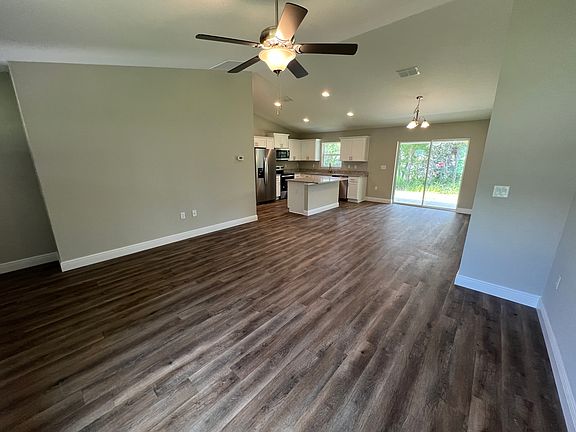 This stunning, never lived in, 3 bedroom/2 bath single-family home offers modern living with an open floorplan and luxury vinyl plank flooring throughout. The spacious living area seamlessly connects to an updated kitchen, featuring quartz countertops, stainless steel appliances, and ample counter space. The perfect split bedroom floorplan features the the master suite to the left side of the home and the two guest rooms to the right. The master suite includes a large walk-in closet and an ensuite bath with a walk-in shower and double vanity. The two additional well-sized bedrooms provide comfort and flexibility for any situation. Step outside to a covered lanai, perfect for outdoor dining or relaxation, right off the kitchen and dining area. This home is perfect for those seeking style and convenience in a desirable Ocala location.