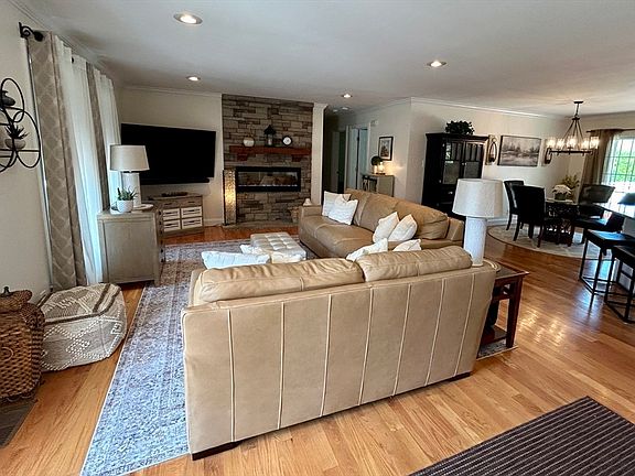 Beautiful executive ranch located on a private road. Pride in ownership is evident! Interior is updated & has an open floor plan which blends the living room, kitchen & dining room. Stunning kitchen features granite countertops, ss appliances, breakfast bar, washer/dryer & sliding glass door. From the slider, step outside onto the back deck that overlooks the generous-sized back yard, creating an inviting atmosphere for gatherings & outdoor activities. 3 spacious bedrooms including a primary suite w/ walk-in closet & private bath. The primary bedroom boasts an oversized window with arched transom–so beautiful! Guest bathroom is updated with tiled tub, new vanity & mirror. Sprawling basement includes oil tank, sump pump, 200-amp electric service, central a/c, new hot water tank & new heating. 2 car garage, fireplace, sprinkler system, stone firepit & shed are a few extras. Make this property your home & experience the epitome of comfort & style. 5 min to beach, highway, shopping.