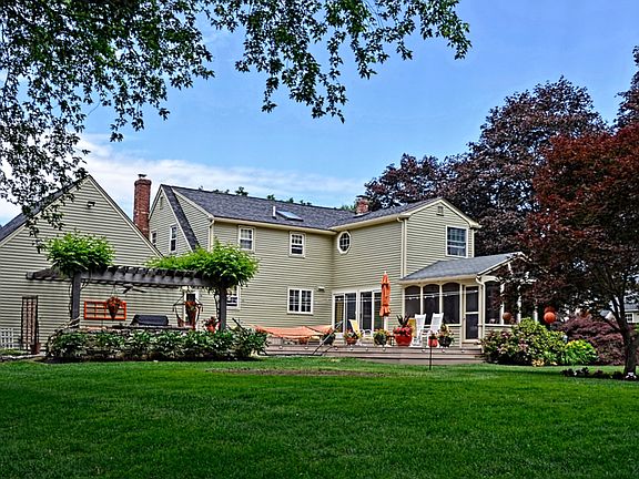 Located on beautifully manicured grounds abutting conservation land, this exquisite 3 Bedroom, 2.5 Bath Expanded Cape w/2-Car Garage, plus a stunning sunroom, screened-in porch overlooking an expansive backyard & gardens, huge composite deck, stone patio w/Pergola & built-in BBQ is a homeowner's paradise! 1st Flr features a well appointed living room w/gleaming hardwood floors & walls of windows allowing for incredible sunshine. The spacious family room boasts a gas FP surrounded by custom built-ins, hardwoods, recessed lights & opens to a gourmet kitchen w/custom cabinetry, granite counters/stone backsplash, WOLF 6-burner range/SS appliances, wine refrigerator, pot filler, a huge kitchen island w/an abundance of seating, pendant lighting & pantry! A half bath w/laundry & mudroom complete this floor. 2nd Flr features an incredible Master BR w/HIS/HER W-I-C's & a spa-like ensuite marble bath w/jetted tub, marble shower w/skylight & HIS/HER vanities & 2 add'l BR's & updated guest bath!