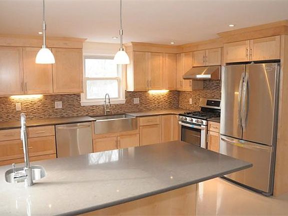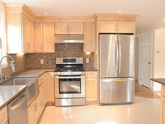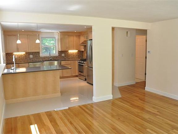 4 Bedroom + 2.5 Bath Cape Single Family Home with driveway parking for 3 cars. Kitchen features marble floors, granite countertops, mosaic tile backsplash, oversized stainless steel farmers apron sink, high-end maple kitchen cabinets and gas cooking. Large granite breakfast bar with mini-bar sink and flex spray faucet. Open kitchen to the living room with fully functional fireplace, formal dining room with one medium bedroom and bath on the first floor. Large master bedroom and two medium-size bedrooms upstairs. Hardwood floors throughout. Forced hot-air oil heating. Newer water heater, roof and windows. Additional 700sf finished basement with half bathroom, washer/dryer, hardwood floors, full French-drain with double sump pumps and plenty of storage. Private fenced-in backyard. 12 month lease Two blocks to MBTA GL-D Eliot. Convenient to route 9, I-95/128, Mass Pike I-90.