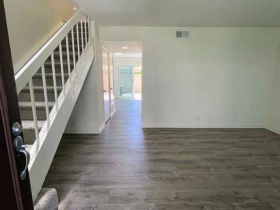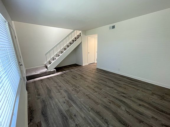 Every detail has been updated, with fresh paint, brand new vinyl flooring downstairs and carpet upstairs, and all new appliances and fixtures. A spacious downstairs living room with a half bath connects to the completely remodeled modern kitchen, with all new white shaker cabinets, stainless steel appliances, and granite countertops. A laundry room off the kitchen includes a brand new full size washer and dryer and additional cabinetry. A large sliding glass door in the kitchen opens out to a private patio, with a brand new vinyl fence, gate access to a covered carport space behind the condo, and an abundance of additional parking in the connected parking lot. The spacious master suite has a large closet with mirrored doors and the connecting bathroom has been completely remodeled with beautiful new tile flooring, glass shower doors, and granite countertops matching the kitchen. The condo also offers an abundance of storage space, with a large locking storage room off the patio, downstairs hall closet, and upstairs linen cabinet.