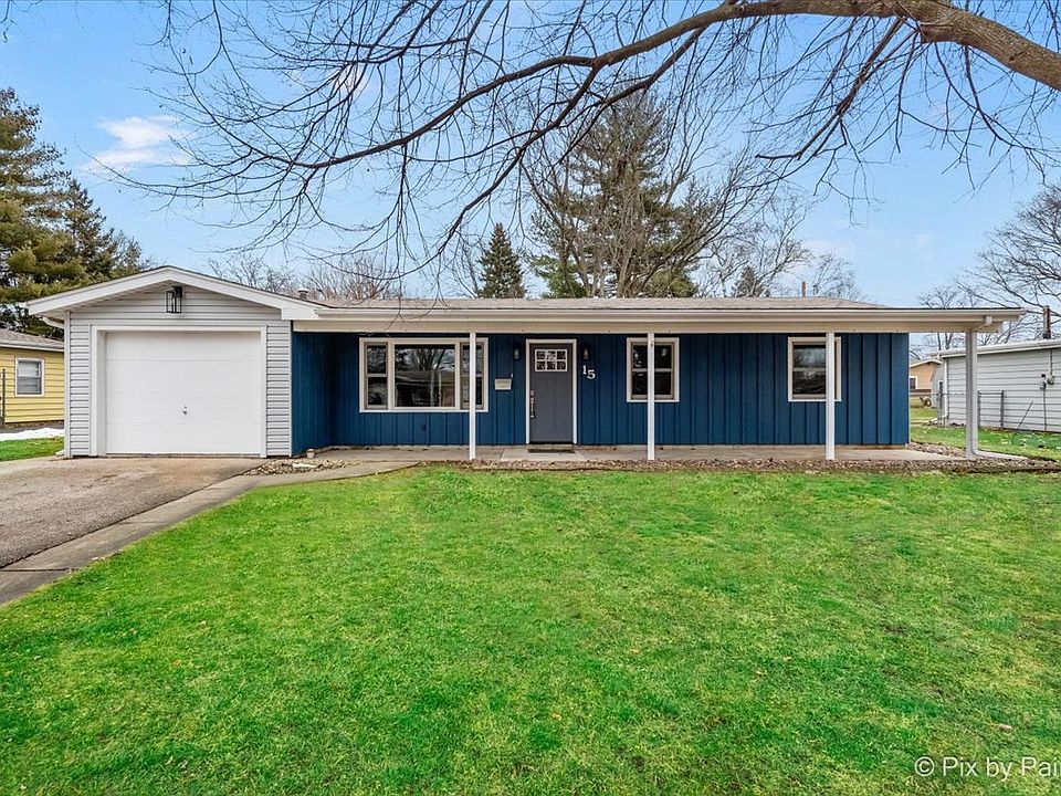 Beautifully updated ranch with 4 bedrooms, 2 full baths and attached 1 car garage. A roomy covered porch greets you. Step inside to fresh paint and large picture window in the open living area. Adjacent is the kitchen with tons of cherry cabinets, granite counters and an eat-in area. Double doors for privacy lead you into a great addition as a private master suite with new carpet, walk in closets, ensuite bath with shower stall and is dual zoned with its own furnace and AC! Down the hall are 3 additional bedrooms with large closets, a shared hall bath with shower over tub combo. A locked 10x7 storage locker is just beyond the separate laundry room with cabinets and utility tub. Enjoy the fully fenced-in backyard with tons of greenspace, spacious deck and shed. Walking distance to Goodwin Elementary school and park, nearby to the Fox River, I-88 and downtown North Aurora.