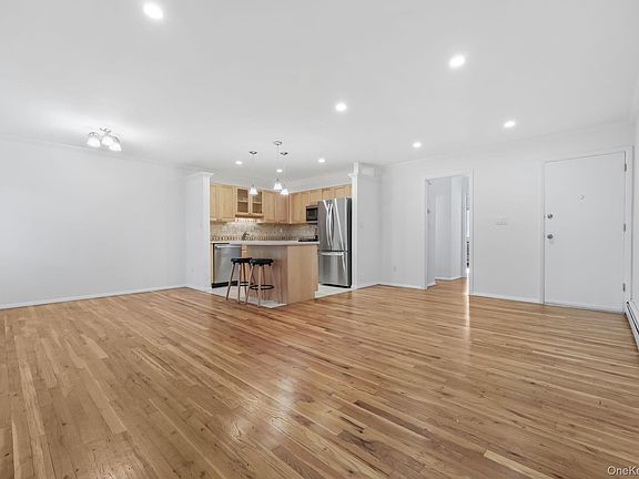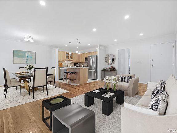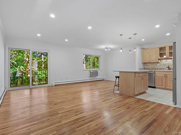 Tranquil Hudson Woods Estates...Just a few steps up, enter into this updated, freshly painted open-concept co-op offering a seamless blend of style and comfort. It features beautiful hardwood flooring and elegant crown moldings throughout. Sliding glass doors lead to a private deck, perfect for outdoor relaxation. The kitchen is a standout, adorned with maple wood, soft-closing cabinetry in a medium oak finish, Corian countertops, a stone backsplash, under-counter lighting, and a matching Corian and maple wood island with deep pull-out cabinets and seating. Pendant lighting adds a modern touch, complementing the suite of stainless steel appliances, including a brand new LG refrigerator with a transferrable warranty, a brand new gas stove/oven, a brand new microwave, and a young Bosch dishwasher. The generously sized bedroom showcases wood flooring, crown moldings, oversized windows that invite in natural light, and a wall of abundant closets with built-in shelving for optimal storage. The renovated bathroom boasts a wood vanity with a stone counter, a glass-enclosed shower with Kohler fixtures, and a convenient teak pull-down seat. A linen closet and double door hall closet with shelving add more storage space! All furnished rooms are VIRTUALLY STAGED. The lower level of the building houses a conveniently located laundry room and an included storage unit for each apartment.