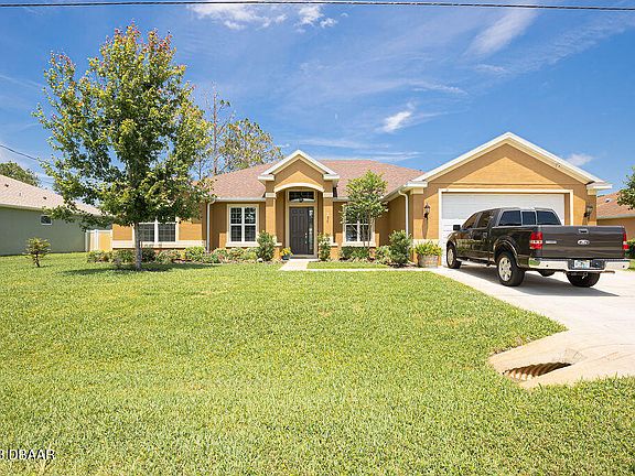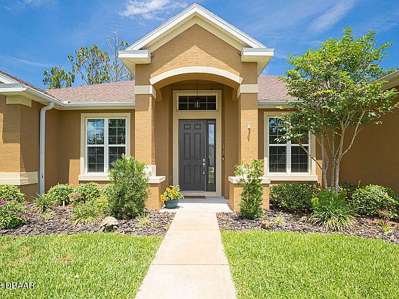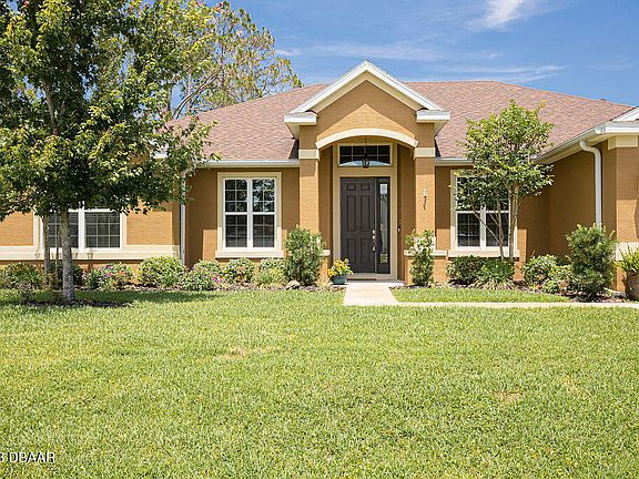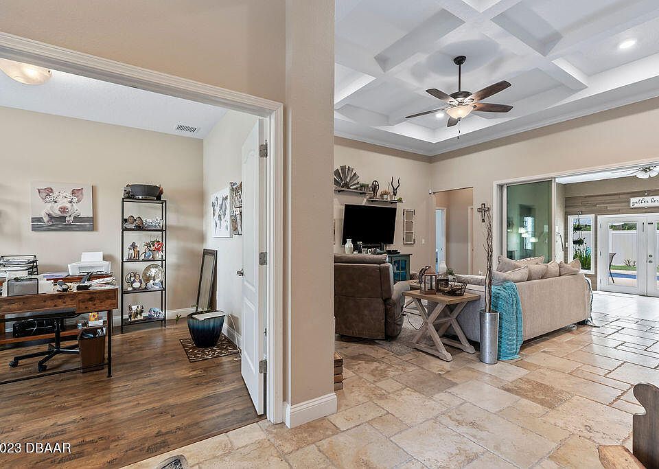 and a luxurious hot tub overlooking the pool. The owner has incorporated all the upgrades, such as crown molding, extra high ceilings, tray ceilings, granite counter tops, solid wood handmade cabinetry with soft close doors and drawers, stainless steel appliances, a beautiful breakfast bar and an ample size eat-in area. The kitchen is open to the large great room with eleven-foot, coffered ceilings and pocket sliders leading to your fully enclosed Florida room. The master bedroom offers a huge walk-in closet with a barn door, gorgeous en-suite bath with an enormous walk-in shower, multiple shower heads, and his & her vanities. There is plenty of room for a large family here with four bedrooms and a dedicated, private office. This amazingly well-maintained home in central Palm Coast is a dream for any buyer, so come check it out today!