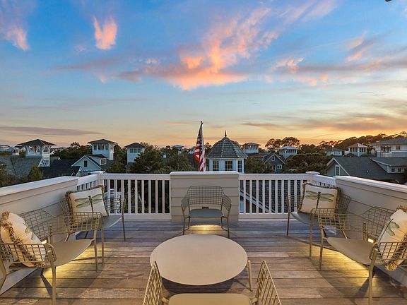 An open-air tower crowns the home, offering sweeping views across WaterSound Beach and the occasional glimmer of the Gulf. Mature plantings wrap the property, adding texture, shade, and an unexpected level of privacy for a home this close to the beach.