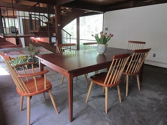 Not your typical Deckhouse! Five second floor bedrooms, two story foyer with the original bluestone floor and indoor garden beneath the suspended mahogany staircase to the upper level. Fabulous floor plan with walls of glass. Separate garage/barn with 3 car bays and storage on second floor. House will need updating. Property offers great privacy and adjoins conservation land --- all in a wonderful neighborhood in great commuter location!
