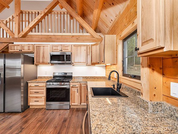 Imagine waking up each day in a home that reflects your style and supports your active lifestyle. Whether you're seeking adventure or a peaceful retreat, this log home in Cross Mill Villages, a 55 plus community, offers the perfect blend of comfort, convenience, and community. Crafted with meticulous attention to detail, this home features a spacious open floor plan blending the living, dining and kitchen areas under a soaring vaulted ceiling. The primary bedroom features a walk-in closet and a luxurious full bathroom. A second bedroom provides flexibility for guests, or can be transformed into a home office or hobby space. An expansive loft area offers ideal space for a reading nook, craft area, or a great place for grandkids. Radiant in-floor heat provides winter comfort in addition to the gas fired wood stove in the living area. An oversized garage provides ample space for two cars with additional storage space. Cross Mill Villages provides a lifestyle of convenience. It's located close to Concord Hospital - Franklin, shopping centers including an outlet mall, and just 10 minutes from I-93. The community abuts the Winnipesaukee River Trail, a 6.1 mile walking and biking trail that runs along the Winnipesaukee river. Concord is just minutes to the south and the Lakes Region is just as close to the north. In a 55+ community 80% of households must have at least 1 household member 55 or over. Interior photos are of an adjacent unit which is a mirror image.