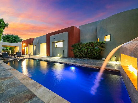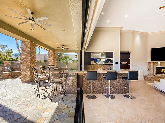 The largest home in Tamarisk Ridge, this 5,510 square foot architectural contemporary delivers the best of desert luxury through balanced design, livable comfort, and seamless indoor-outdoor connection. Set within Rancho Mirage's guard-gated Tamarisk Ridge community near Tamarisk Country Club, the residence blends architectural sophistication with the warmth of a private retreat.Fleetwood pocket sliders open to multiple outdoor entertaining areas designed for every time of day. The rear yard centers around a dramatic pool framed by mountain views and generous lounging spaces, while the front courtyard features two fountains, including one incorporated into the spa. Water and fire elements appear throughout the property, bringing light, motion, and ambiance to the home's modern design.A wraparound bar connects the great room to the front patio, creating an effortless flow between interior and exterior entertaining spaces. Inside, high ceilings and natural light define an open layout anchored by the great room and dining area, complemented by a separate formal dining room ideal for larger gatherings. The kitchen features a large granite island, step-in pantry, and professional-grade appliances, connecting seamlessly to the main living areas.The primary suite offers a fireplace, sitting area, and an oversized walk-in closet with dual entries. The marble bath includes a luxurious wrap-around shower and soaking tub that create a true spa experience. Each additional bedroom features its own ensuite bath, offering privacy for family or guests.Additional highlights include paid solar power, a temperature-controlled wine storage room, built-in barbecue, glass design entry doors, and golf cart access to Tamarisk Country Club. Ideally located near world-class golf, dining, and shopping, this residence balances refined architecture, natural beauty, and timeless desert living.