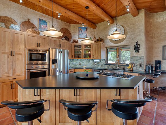 Welcome to your private resort nestled at the base of the foothills in Placitas. 3 secluded acres offering privacy for that summer dip in the pool or hot tub. The inviting floorplan offers elegant classic Southwest styling with a cozy, charming atmosphere. Two custom kiva fireplaces enhance the living and family rooms. A central island with bar seating for four invites lots of helpers in the kitchen. Cozy dining is found off the kitchen & family room with an open design. Formal dining is also included in the living dining combo for those special occasions like dinner with friends. Luxury appliances make cooking a breeze. The rear portale for spectacular Sunset viewing on Sunset Blvd. Follow the sunroom pool & hot tub enjoyment with a hot sauna in the primary bath. You can have it all!