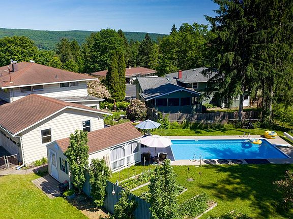 Four bedroom, two full and one-half bath Colonial located in one of Norwich most desirable developments. Light and bright throughout, the first floor features a huge living room with meticulously maintained hardwood flooring, bluestone hearth with gas fireplace, and new oversized windows to enjoy the awesome hillside views. Living room opens to formal dining room with sliders to back patio. Large eat-in kitchen with ample cabinet storage and breakfast bar separation to eat-in area. First floor rounded out by remodeled half bath and den/office with built in shelving & storage. Second floor offers four large bedrooms with hardwood flooring and remodeled full guest bath. Master bedroom with extensive closet space and upgraded full bath with walk-in shower. Full basement with ground level, window filled family room or rec room, also features a woodburning fireplace. Separate finished laundry room and ample utility room storage and workshop round out the basement space. Awesome outdoor space with inground pool and large poolhouse storage building featuring a screened in porch - great for entertaining or taking a break from the sun. Separate stone patio area with mature landscaping. Additional property features include two car garage and a double lot with fenced in level yard space. Great House, Great Location!