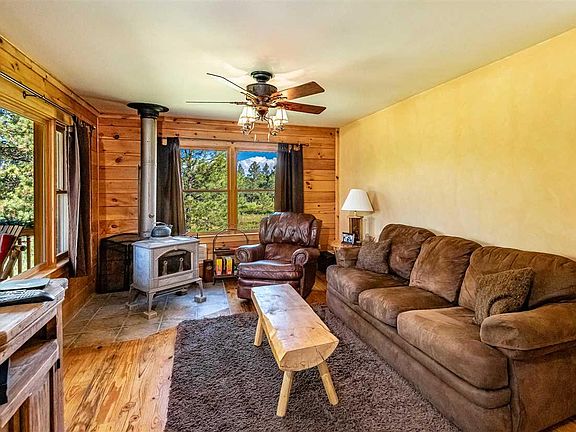 The cabin in the woods you've been looking for. Log sided, wood burning stove, perfect setting (right off the asphalt county maintained hwy) nice views on an acre, outdoor fire pit, covered deck, storage shed and an attached garage for your toys too! Just 15 minutes south of Angel Fire.