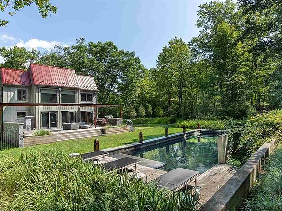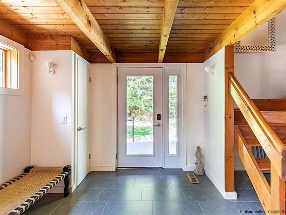 This serene contemporary is under two hours from NYC, and just a 10 minute walk to the heart of Woodstock, with its world class restaurants, music, and art scenes. This elegant home has a fully equipped chef's kitchen that includes a Hestan Range (used at French Laundry), Liebherr high end fridge, and Miele dishwasher. The primary bedroom has a huge en suite bathroom with a soaking tub and shower. There are two large guest bedrooms (one on the first floor that is currently used as a media room) with bathrooms as well. This space is designed for relaxation and comfort all year round, with a newer HVAC system for summertime, and a hot tub, infrared sauna, and two cozy woodstoves in the living room and media room for the cooler months. The double height living room with its two sets of double glass doors welcomes natural light and views of the outdoors. Outside, enjoy two acres of architect designed grounds in total privacy, surrounded by local perennial plants including a meadow, birch grove, iris beds, native ferns, board-formed concrete retaining walls, a curved korten steel fence, and a stone pathway to an additional seating area. There is over 600 square feet of decking that includes an outdoor shower, a sectional outdoor couch, a Wolf gas outdoor grill, a Moroccan tiled table and seating, and a korten steel pergola with brise soleil for comfortable dining. The heated saline gunite swimming pool is 46' x 20' - perfect for laps (or just cooling off) with three lounge chairs for sunning and sipping cocktails. There is an attached carport providing protected entry to the lower level, with parking for two cars, two 240V EV charging ports, and ample parking for guests. This turn-key oasis is under two hours from NYC, 12 minutes from the NYS Thruway, 25 minutes from Amtrak.