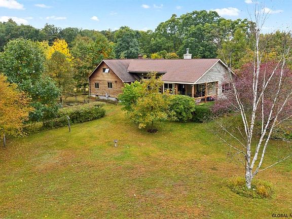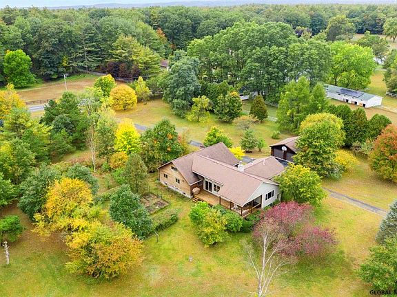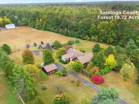 No Subdivision, Nothing Cookie-Cutter. Unique, Thoughtfully Updated Ranch w/ Tremendous Privacy, Mission-Style Design & Green-Conscious Solar Living on 5 Acres w/ Barn Bordered by Saratoga County Forest land! Originally a simple log home, savvy seller added a massive custom addition in 2005 that transformed the home adding: mudroom, half-bath, great room, private master suite, sizable covered porch/deck, + walkout modern basement. Throughout you'll find mission-style simplicity in the craftsmanship (solid wood doors, floors, windows/trim) and a well-planned design making the best use of its setting. Privately-owned solar panels tucked out of sight at the rear of the land, save you thousands each year on electric. NEW Quartz counters in kitchen, NEW furnace! *Open Sunday 10/4 from 12-2*