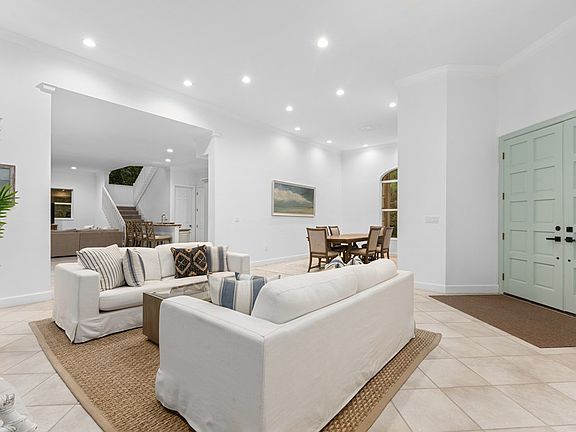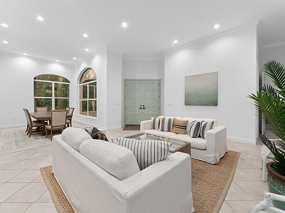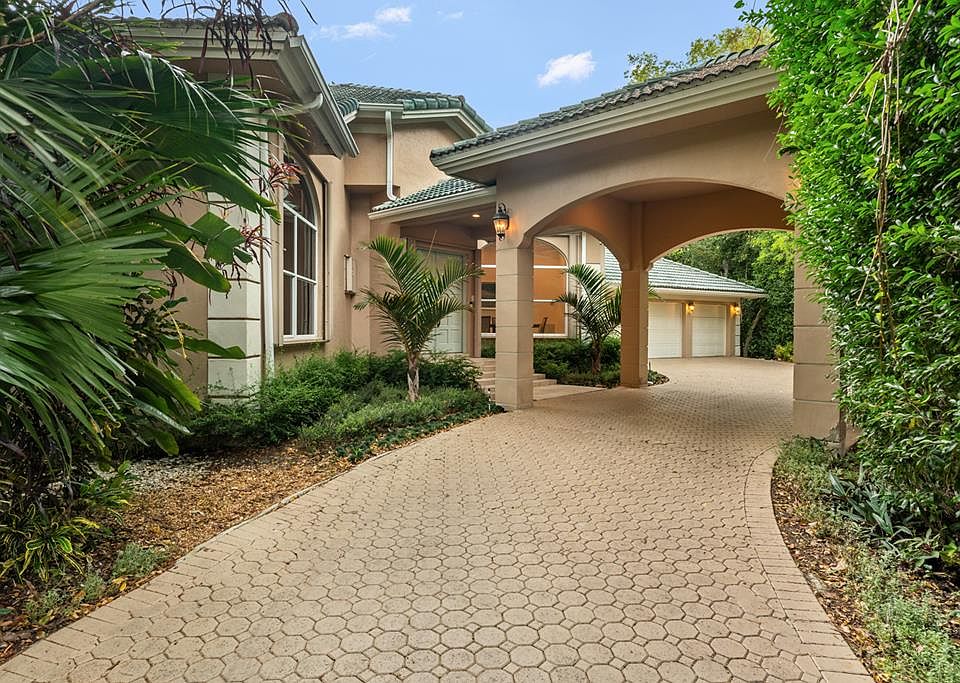 Welcome to this lovely 4-bedroom, 4-bathroom home, where elegance meets comfort in every detail.  The entrance includes a scenic driveway lined with mature trees and blooming orchids—offering both privacy and a truly picturesque welcome.  This home boasts soaring high ceilings, a spacious 3-car garage, and a seamless blend of indoor and outdoor living.  Step outside to your personal resort oasis featuring a sparkling pool complete with in-water bar stools and a convenient pass-through bar—perfect for entertaining. A separate covered cabana invites year-round enjoyment with its cozy fire pit and outdoor shower, offering a true spa-like experience.  Designed for both relaxation and gatherings, this home is an entertainer's dream and a serene retreat all in one.