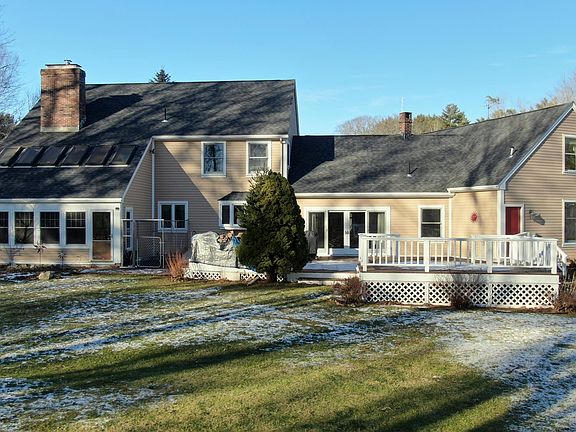 This stately and spacious Colonial is beautifully sited on 2.1 acres with pond and river frontage and views, yet close to town. The cherry kitchen offers plenty of cabinets, desk, wine fridge and more. Family room with wood stove and glass sliders to oversized deck, dining room or office, sunroom facing riverfront and finished space over garage for hobbies or parties! Hardwood and tile floors, skylights, 2nd floor laundry, extra 1/2 bath with set-tub off hall to garage, newer roof and gutter system, excellent maintenance record! A great property!