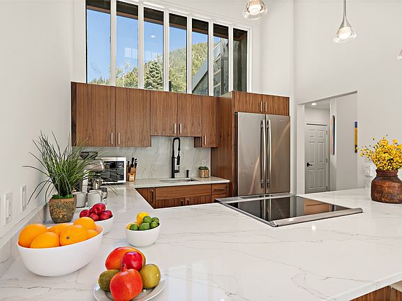The premier offering in the Predock in Taos Ski Valley, this superbly remodeled residence offers a clean contemporary style with lots of sunlight and beautiful views! The entry level features an open concept dining area and living room with a soaring vaulted ceiling and a portal balcony overlooking the village to the mountain views. The kitchen has plentiful workspace and storage and features a large counter with bar seating. The guest bedroom and bath are found on this level as well, along with the washer and dryer. Upstairs is an office or seating area that leads to the primary bedroom and bath, and there's a loft in the bedroom. Another very nice balcony portal off the bedroom has a great view of the ski mountain and down the valley. The home comes with a parking space in the large covered carport of the complex. All just a short distance from the base of Lift One and the Plaza in the base of the ski area. A delightful feeling awaits in this wonderful mountain home! Owner NMREB.