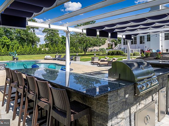 This exceptional property is exquisite in amenities, location, and designer finishes. Located in the most sought-after neighborhood in Mullica Hill, situated on a 3-acre home site that backs to woods and wetlands. The classic brick elevation and manicured landscaping sets this home apart from the curb. The entry is just gorgeous, with a dramatic split-bridged staircase featuring wrought iron balusters and designer carpeting. This graceful open center hall is fabulous for entertaining, with formal living and dining rooms that open to the casual conservatory featuring richly paneled millwork that's drenched in natural light. The gourmet kitchen is well-appointed with an extended island, gorgeous granite, double wall oven, recessed and under-cabinet lighting, tile backsplash, and a light-filled vaulted morning room with built-in cabinetry and serving counter. The family room is just beautiful, with a floor-to-ceiling stone fireplace and a complimenting curved wall. The Primary bedroom includes a sitting area, a lavish tiled en-suite, and of course, 2 large walk-in closets. Additional bedrooms are all generous in size; two share a Jack and Jill bath, and one is a junior suite with a private bath. The fantastic lower level features over 2,200 sq. ft. with daylight windows and a walk-out slider, plus a custom built-in bar, family room, exercise area, half bath, separate office, and playroom! Run away to your own private paradise in the incredible resort-style backyard, complete with an in-ground heated gunite pool with sundeck and spa tub, shade pergola canopy with sails, fire pit, granite bar, built-in gas grill, and refrigerator. The rear yard paradise has been totally updated with an extended new paver patio providing even more space for outdoor enjoyment. Additional bonus features included in this exceptional home include: Roof is only 2 years old, new 1st floor hvac, ALL NEW designer lighting, updated septic, whole-house generator, all Bella custom window treatments and plantation shutters throughout, newer designer carpeting, maintenance-free decking, play set, shed, and fencing. The beautiful community of Woodland Estates is just minutes to the charming historic downtown that offers shopping, dining and plenty of events. Serviced by Clearview Regional School, just 30 minutes to Philadelphia, and only minutes to N.J. Turnpike exit 2 and routes 295 and 55. The brand new Inspira hospital is just 15 minutes down the road. Come and experience Mullica Hill living in one of the most exceptional properties in town! When you deserve the very best, this one is it!