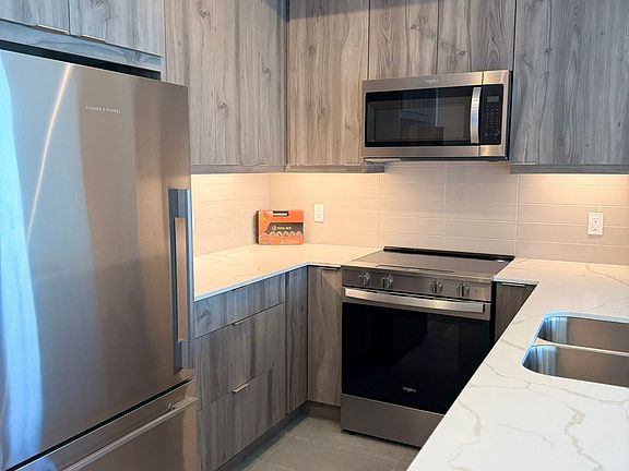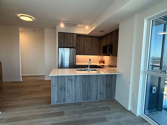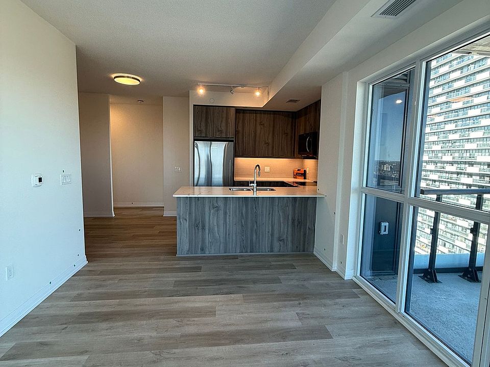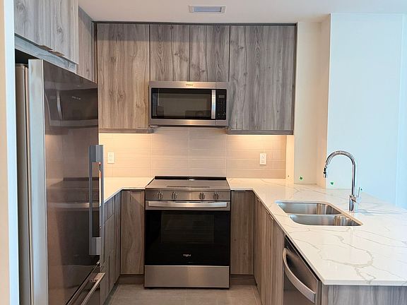 Floor to ceiling windowsBright open-concept layoutVersatile denModern kitchenSleek cabinetryQuartz countertopsStainless steel appliances