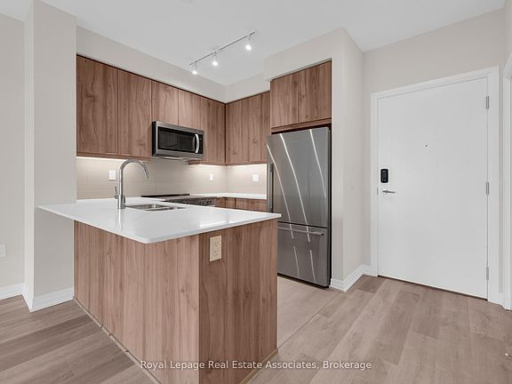 Open-concept layoutLarge windowsNatural lightSleek wood-toned cabinetryQuartz countertopsBuilt-in breakfast barStainless steel appliances