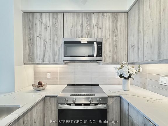 Floor-to-ceiling windowsSleek laminate flooringStylish kitchenQuartz countertopsCeramic tile backsplashPlenty of cabinet spaceBrand-new stainless steel appliances