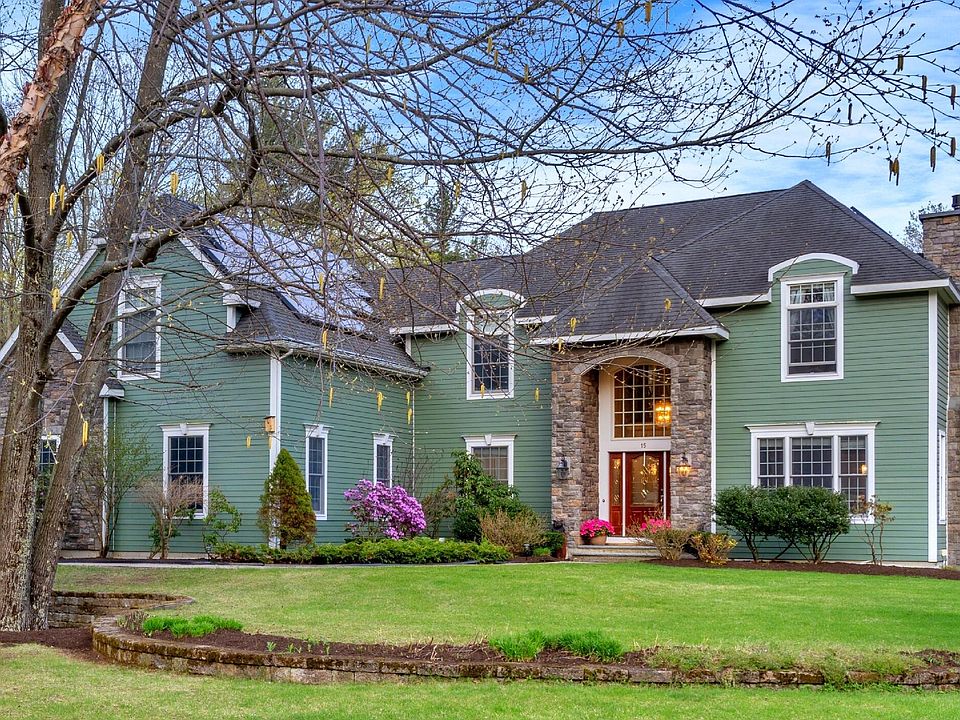 The stunning chef's kitchen showcases high-end appliances, granite countertops, a coffee bar, and a large island for both daily living and entertaining. It flows seamlessly into a sun-drenched dining area and family room with a fieldstone fireplace, and connects to both a formal living room and elegant dining room.
