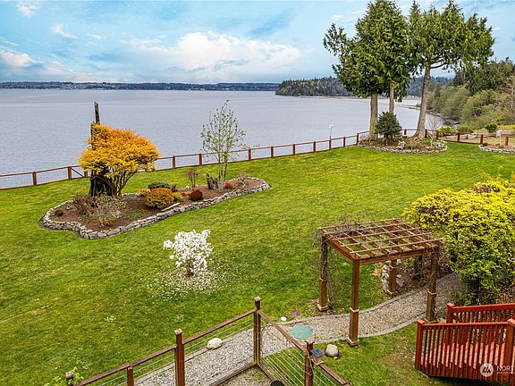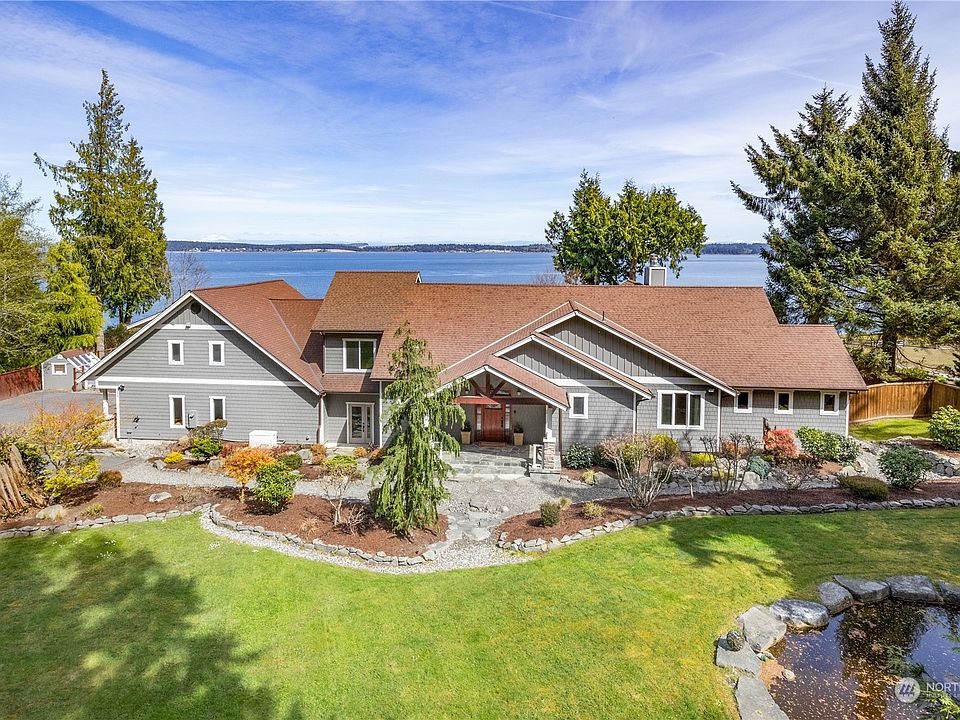 This beautiful, private 5-acre estate boasts 202 feet of waterfront and panoramic views of Puget Sound, majestic Mt. Baker and the Cascade Mt range! Lush gardens, mature trees, and a peaceful pond and waterfall greet you on arrival. Inside this inviting home is a chef-grade kitchen with quality appliances, custom cabinets & copper sinks. Main living space opens to a covered patio which overlooks the water & mountains. The luxurious main ensuite has a fireplace, heated bath floors & patio access. An attached apartment with separate entrance, full kitchen, bath & bedroom is perfect for guests or a home office. Includes a full-house generator, heated garage and gated entry. Close to services, golf, marina, beaches and just 1.5 hours to SeaTac.