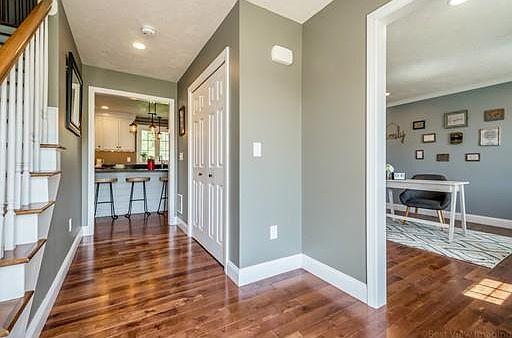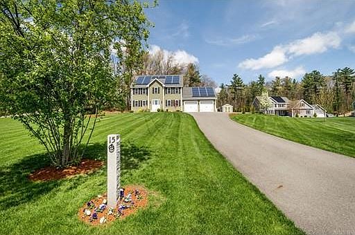 This open concept Colonial home offers all the advantages of a like-new home with the benefits of a desirable and well established neighborhood community. At the hub of this beautiful home is an enviable white cabinet kitchen with center island,stone counters, & stainless steel appliances opening to a sun drenched dining area and generously sized living room where visitors can comfortably gather. Sliders open to the composite deck overlooking a lush, flat backyard inviting you outside on those warm summer days. The 2nd floor boasts a luxurious master suite with versatile space for nursery or office, walk in closet & master bath w/dual sink vanity, 2 additional bedrooms with full bath, and laundry. Enjoy movie night in the finished lower level complete with electric fireplace and projector TV and screen. High efficiency home with propane heat and seller owned solar panels. Great commuter location - close to Route 2 and commuter rail.