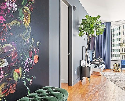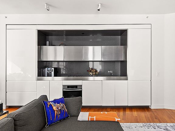 This corner residence boasts floor-to-ceiling windows and soaring ceilings, flooding the home with natural light and offering sweeping city views. The open-plan living and dining area is ideal for entertaining, with a chef’s kitchen featuring custom cabinetry, Caesarstone countertops, and top-of-the-line appliances by Miele, Gaggenau, and Sub-Zero.