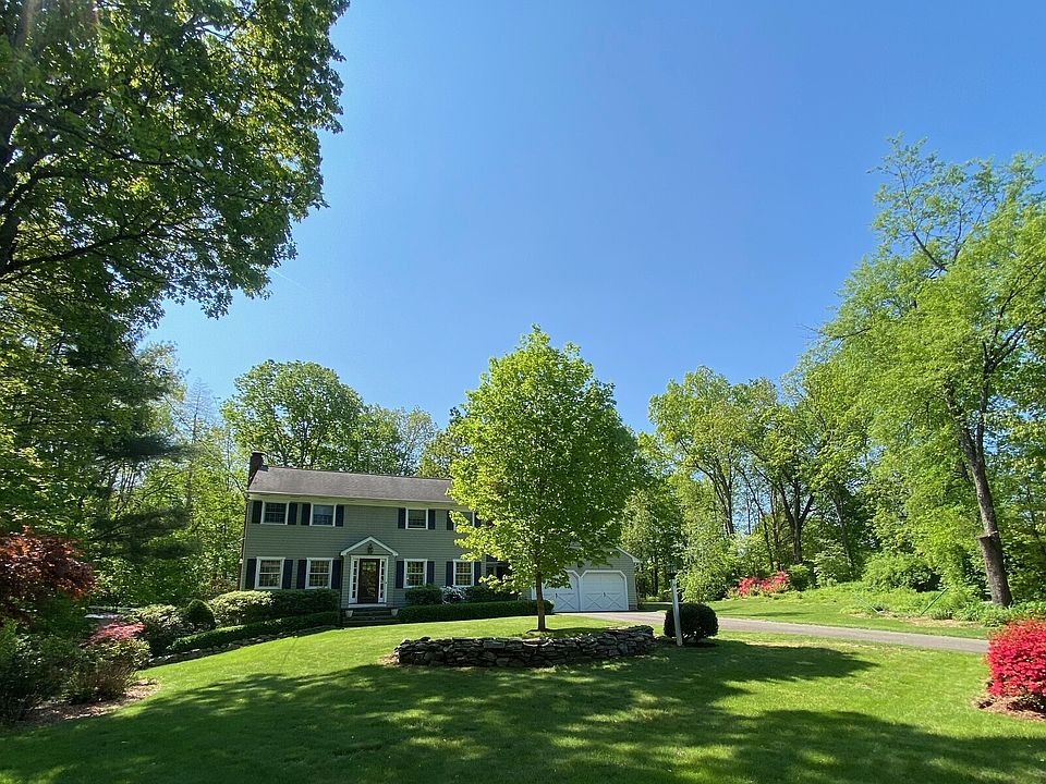 This custom-built, center-hall Colonial combines timeless design with thoughtful updates - and it is in move-in condition ready for you to enjoy from day one. The main level features a beautifully remodeled open-concept kitchen, dining area, and family room - the perfect setting for everyday living and entertaining. A formal living room with a stunning fireplace, a formal dining room, a private home office (or possible optional 5th bedroom), and a stylishly remodeled half bath provide versatility and comfort. Added to all this is a mudroom entry from the attached two-car garage which includes full walk-up attic storage. Upstairs, you'll find 4 spacious bedrooms and 2 newly remodeled full baths featuring fresh, designer finishes. Rich hardwood floors and custom millwork throughout the home adds warmth, character, and craftsmanship rarely found in newer builds. The walk-out lower level includes a 2nd fireplace, designer ceiling beam, and direct access to a lower patio, offering excellent potential for additional living space, or an in-law set-up. Set at the end of a quiet cul-de-sac, the private one full acre property is a gardener's dream - rolling lawn, mature plantings, colorful established gardens with flowers galore, stone walls, woods, and walking paths. Outdoor living is enhanced by a large bluestone patio bordered by a custom-built stone wall. A matching bluestone front walkway and entry steps provide a gracious welcome. Lovingly maintained by only its second owner, this home is within walking distance to the historic Huntington Green. It is a rare find right in the heart of Huntington you do not want to miss!