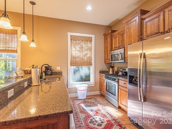 Beautiful 2 Bedroom 2 Bath one level open concept living room, kitchen and dining room. On the lower level that you access on stairs. The living room has floor to ceiling stone fireplace. A door leads out to a large porch with rocking chairs looking into tranquil woods and nature. Master Bedroom is large with a large master bath.