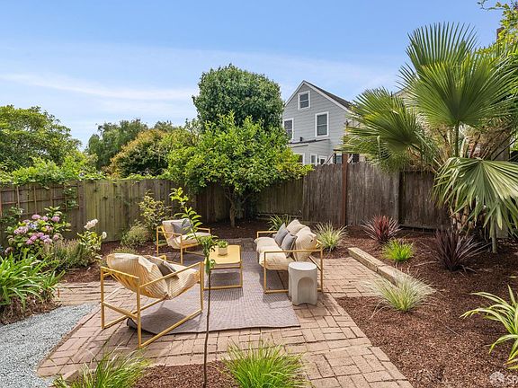 Bright and stylish Bernal Heights home located on the sought-after north slope, one and a half blocks to Cortland Avenue. A Victorian facade is complimented by a unique and charming interior with a thoughtful, high design remodel. Tall ceilings, original softwood floors, and an exposed fireplace are enjoyed in the open living room and dining room with green outlooks. Adjacent is a spacious, updated kitchen with abundant storage, custom finishes, and lovely western light. A bedroom/office and full bathroom complete the main level. Upstairs, a sun-lit primary bedroom offers high, pitched-roof ceilings, a separate seating area with lovely outlooks, and an en-suite bathroom. Across the hall is a kids/guest bedroom with outlooks to the bay. Accessed from the kitchen, a west facing garden a brick patio for seating & entertaining, and lush greenery. Completing the home is a spacious one-car garage with storage and laundry area, connected to a lower level bonus room (great home office) with its own exterior door and entrance. 1,544 SF of living space + 184 SF bonus room. Amazing location, steps to Bernal favorites and Bernal Hill.