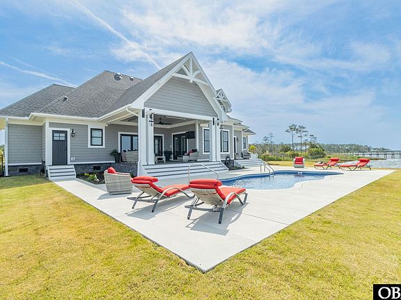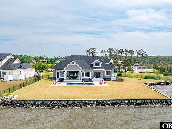 Built in 2024, this stunning soundfront home in a private boating community on Roanoke Island is a must-see! From a home theater to a heated back patio beside an inground saltwater pool, this property truly has it all. Upon entering through the Heritage Point community gates, continue toward the sound, where you’ll find Battlefield Court—just beyond the boathouse, docks, and tennis/pickleball courts. As you approach the house, you'll immediately be struck by its beautiful exterior and expansive landscaped yard, featuring 308 feet of sound frontage and a brand new bulkhead. Step through the tall double front doors into a foyer with cathedral ceilings, a gracefully curved staircase, and the soothing sound of a built-in waterfall. From the foyer, you’ll enter a spacious open-concept living area that connects seamlessly with the kitchen and dining room. Large glass doors and windows flood the space with natural light and showcase panoramic water views from every angle. The living room boasts a gas fireplace, brand-new furniture, built-in shelving, and a flat-screen TV. It’s glass doors are part of a disappearing wall opening up on the sound side allowing you to enjoy the sound breeze throughout this open living space. The adjacent kitchen features crisp white custom cabinetry, elegant white quartz countertops, a commercial-grade range with a double oven, and additional stainless steel appliances. The oversized island makes this space ideal for cooking, meal prep, and entertaining after a day on the water. Nearby, a large walk-in pantry with double barn doors and custom shelving provides ample storage. The dining room, with its expansive table and generous seating, offers a perfect setting to enjoy meals with a view. Both the living and dining areas open onto a covered back deck—an outdoor oasis equipped with comfortable furniture, ceiling fan, heaters, and a flat-screen TV. Whether you're relaxing in the shade by the pool or watching a game on a crisp fall evening, this space is ready for every occasion. On the north side of the home, you’ll find a dedicated home office at the front, a half bath with pool access at the rear, and a state-of-the-art home theater. The theater features a full-wall screen, premium projector system, surround sound, built-in storage, and a plush sectional—bringing the cinema experience right into your home. On the south side, beyond the kitchen, a large built-in fish tank adds a unique, custom touch. Nearby, a beautiful ensuite bedroom opens onto a private soundfront deck. The luxurious bathroom includes a sizable tiled shower, a freestanding soaking tub overlooking the sound, and double vanities with lighted, anti-fog mirrors. The ensuite also features a spacious walk-in closet with custom shelving—perfectly designed for comfort and convenience. Also on the first floor is a second bedroom with a full bathroom and tiled shower, a generous laundry room with utility sink and access to the fish tank. Custom cabinetry in the drop zone off the garage provides the perfect space for daily essentials. Upstairs, you’ll find two additional bedrooms, both with sound views and large walk-in closets. They share a Jack-and-Jill bathroom featuring a huge tiled shower, double vanity, and upgraded anti-fog, lighted mirrors. Both rooms are spacious with beautiful views. The home's exterior is just as impressive. The inground saltwater pool offers unobstructed views of the sound and is surrounded by nice pool furniture. Additional features include half bath access for poolside convenience, a whole-house generator, irrigation system, full security system, and a spacious garage for vehicles or golf carts. If you’re looking for a move-in-ready, top-of-the-line soundfront home, this is it. Call today to make this extraordinary property your own!