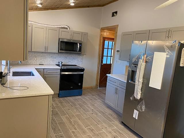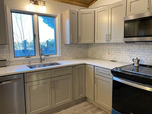 Quartz countertops, new cabinetry, and a full suite of stainless steel appliances (refrigerator, electric range, microwave, and dishwasher)