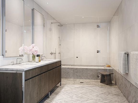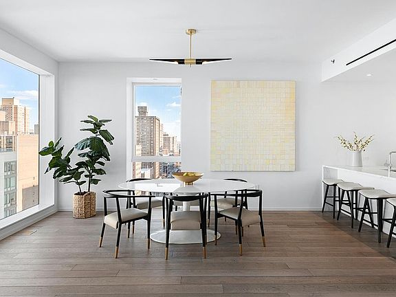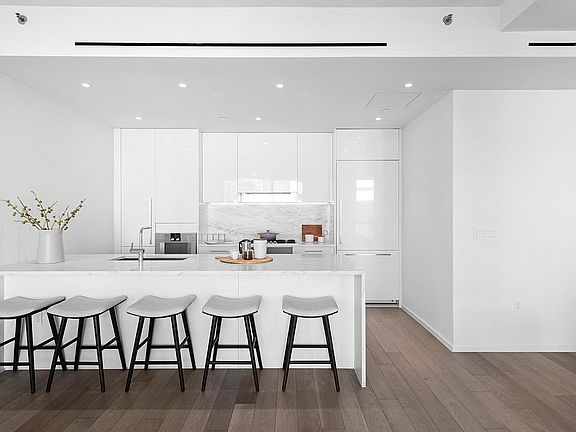 Perfect for both entertaining and everyday living, the residence offers floor-to-ceiling windows, wide-plank oak flooring, and an open-concept living and dining area anchored by a chef’s kitchen appointed with Gaggenau appliances and custom white lacquer cabinetry.
