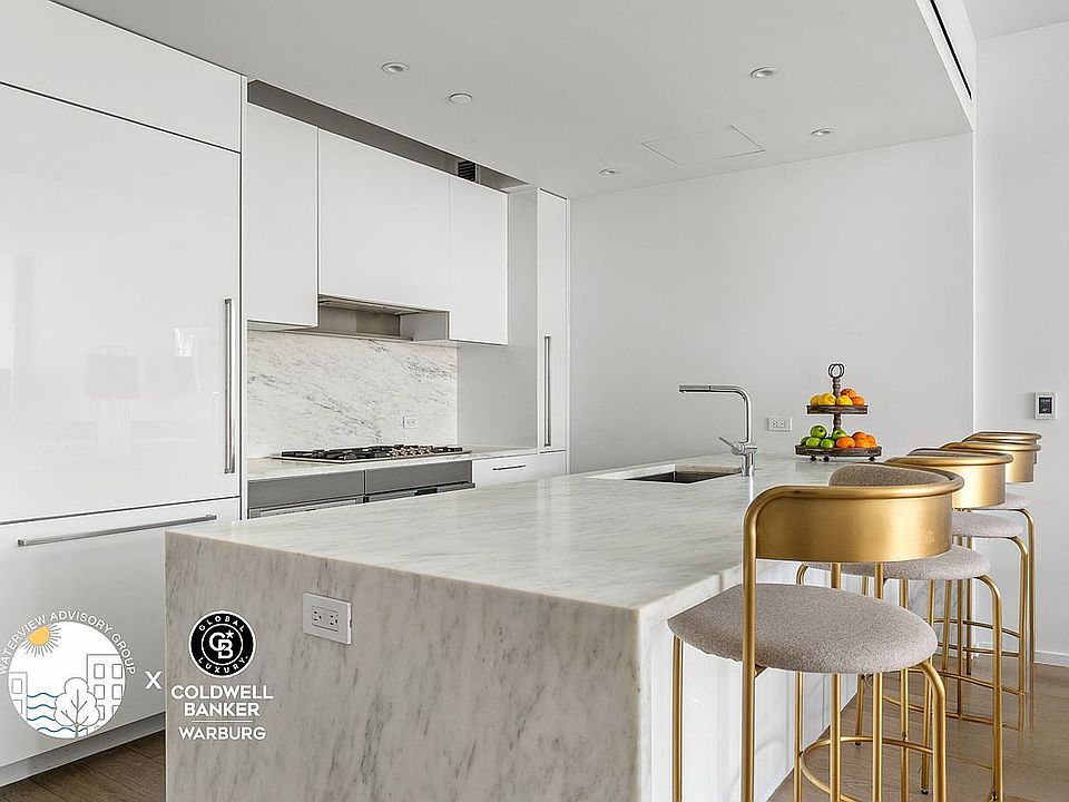 “Showcasing unrivaled craftsmanship, the brilliant open concept kitchen was custom designed by Urban Homes featuring high-gloss white lacquer cabinetry by Aster Cucine, Gaggenau appliances, and wine cooler. The unique kitchen countertops and backsplash are Danby Marble locally sourced from Vermont.”