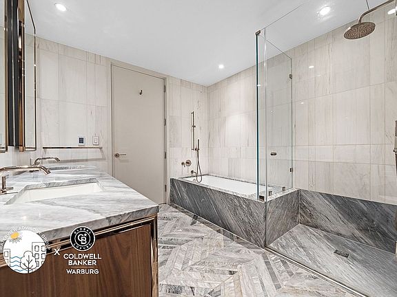 South-facing floor-to-ceiling windows, spa-like five-fixture with Grigio St. Nicolas marble chevron floors, double vanity with custom walnut cabinetry, as well as an oversized deep soaking tub and separate standing shower.