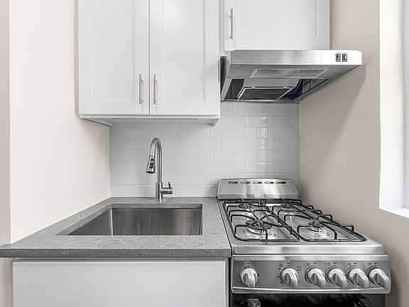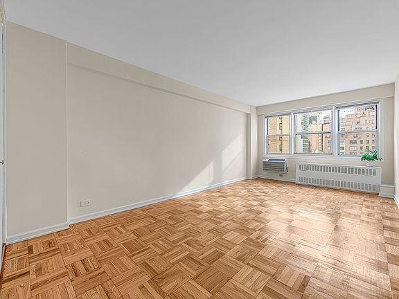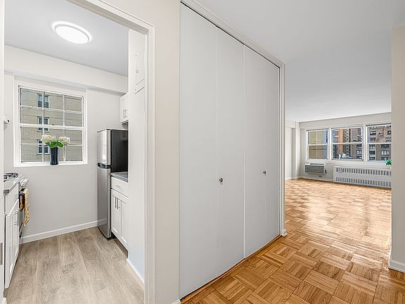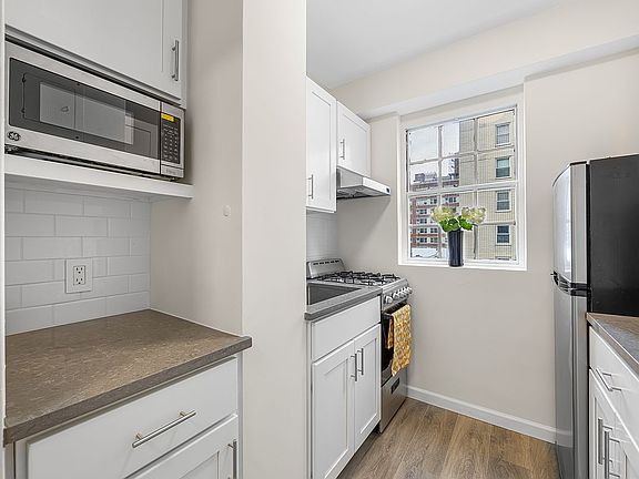 The studio also features an enormous closet, a brand-new kitchen, and a modern bathroom. The kitchen is outfitted with custom slate-white cabinetry, quartz countertops, a four-burner gas range, a stainless steel refrigerator, a fitted microwave, and a window that fills the space with natural light. The sleek new bathroom boasts a contemporary LED-lit medicine cabinet and premium finishes, adding a touch of luxury to your daily routine.