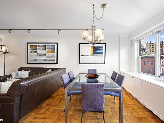 Apartment 5F offers a generous layout that boasts a gracious entry foyer that opens up to the oversized 31-foot-long combination living and dining room. This expansive gathering space culminates in wall-to-wall windows, complete with custom built-in cabinetry, looking north over East 61st Street. Hardwood parquet floors, base and crown molding, and recessed and track lighting grace the apartment throughout. A windowed flex space, currently configured as a den, sits adjacent to the living room. This additional space is perfectly suited to become a second bedroom or a formal dining room.