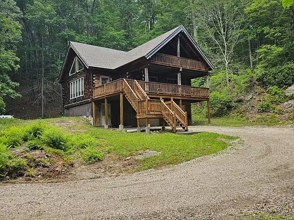 This wonderful log cabin home is brimming with character and sits on a private 10+ acre parcel. Inside you will love the open floorplan, character wood beams and large windows/sliding doors which frame generous nature views outside. The home feels significantly larger and is well proportioned, especially in the living and dining rooms. The kitchen offers ample work area and storage. Glass sliding doors access a great covered porch which steps out from the kitchen and dining areas. One bedroom and full bath is located on the main level with a tremendous loft bedroom, exterior balcony and full bathroom situated above. The lower level offers a large two car garage, laundry and immense storage. There are endless options for expansion and to make the property useful for trails, 4 wheelers, hunting, horses or other wildlife. Very low real estate taxes! New roof, gutters, gutter screens & SS refrigerator in 2023. Heating, cooling and tankless hot water heater all replaced in last 1 to 9 years. This home needs nothing and is ready for it's next owner. An excellent weekend getaway, downsizing option or ideal for for a hunting enthusiast or anyone seeking privacy and character! Low Low Real Estate Taxes! Come and have a look!