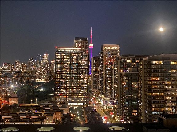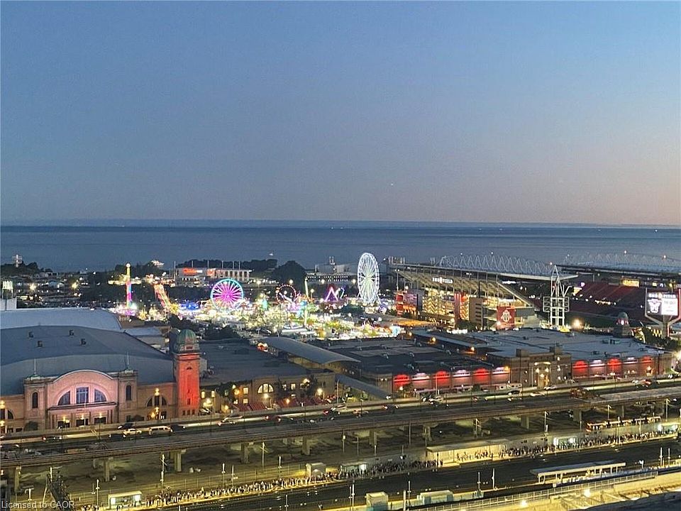Whether you're looking for a place to call home or a solid investment opportunity, this condo delivers. Owner-Occupied Southeast Corner Unit with Stunning Panoramic Views! Experience elevated living in this meticulously maintained corner suite, bathed in natural light and offering panoramic views of the Toronto skyline, the iconic CN Tower, and the serene waters of Lake Ontario. This southeast-facing unit is bathed in natural light through floor-to-ceiling windows and features high ceilings, smooth finishes, and upgraded flooring throughout.The open-concept kitchen, dining, and living area offers seamless flow and unobstructed views, with a walk-out to a spacious 112 sq. ft. balcony perfect for enjoying sunrises. Floor-to-ceiling windows and high ceilings for an airy space. Open-concept living with walk-out to balcony featuring south and east exposures. Functional layout with a dedicated den with a sliding door closet and in-suite laundry. Primary bedroom with spectacular lake and BMO Field views, walk-in closet, and ensuite bathroom. Second bedroom with striking CN Tower views & sliding door closet. Each bedroom fits a queen-sized bed comfortably. One additional 4-piece bathroom. Natural stone accent wall in the living area. Includes a large locker, 1 parking spot, and 1 bike storageUnbeatable location just steps from all essentials Metro and No Frills. Surrounded by trendy restaurants, bars & banks. Minutes to waterfront trails, TTC & Exhibition GO Station. *For Additional Property Details Click The Brochure Icon Below*