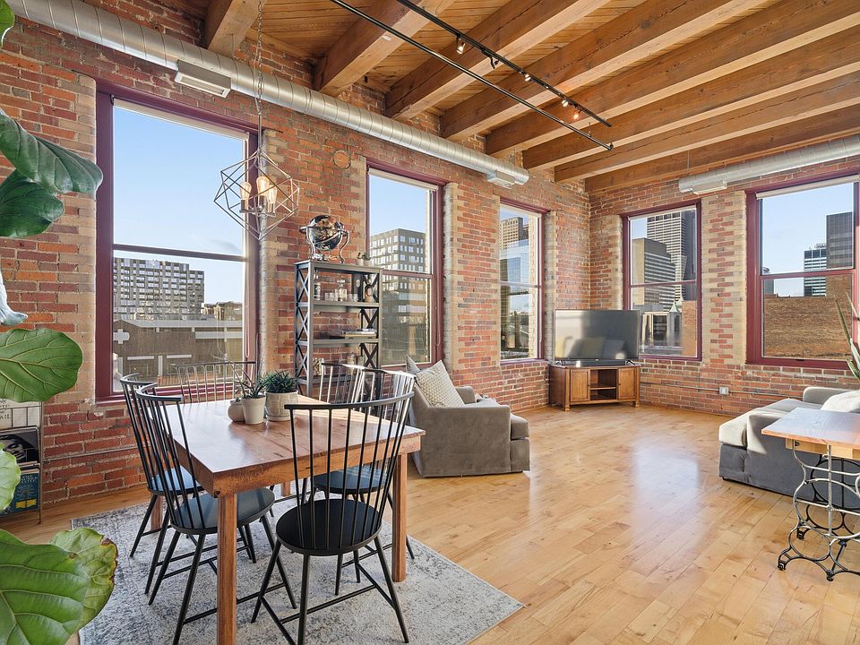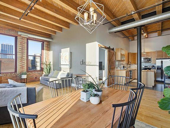 Discover this rare two-bedroom corner unit in the historic Hartman Lofts, showcasing the perfect blend of modern comfort and timeless charm, along with amazing views of the downtown skyline. Experience the elegance of beautifully refinished wide-plank natural maple wood floors and soaring wood beam ceilings that enhance the open layout. The exposed brick walls and an abundance of natural light create a warm and inviting atmosphere, epitomizing true urban living.